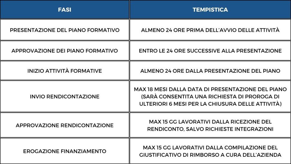 - tempistica ridotta: sia per la presentazione, che può essere effettuata sino al giorno precedente l’avvio delle attività formative, sia per l’approvazione del Piano, che avviene entro 24 ore dall’invio;